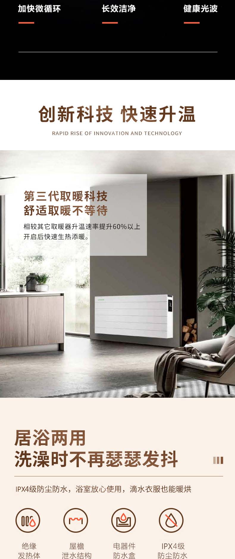 导热高效快速,即用即热,热辐射面积大,全屋快速升温,温暖无需等待