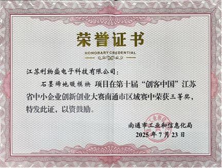 附荣誉证书:江苏利物盛电子科技有限公司“石墨烯地暖模块”项目,在第十届“创客中国”江苏省中小企业创新创业大赛南通市区域赛中获三等奖,由南通市工业和信息化局于2025年7月23日颁发证书鼓励。
