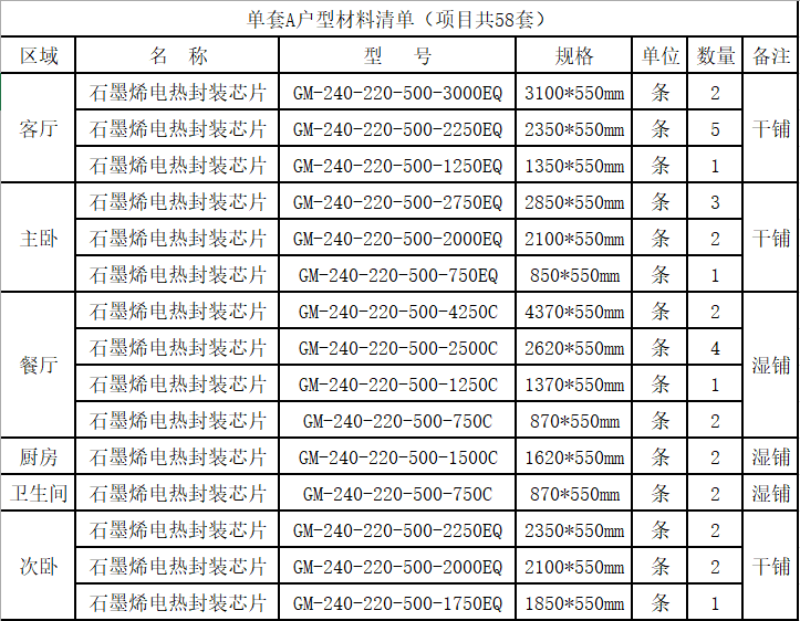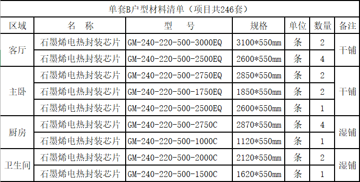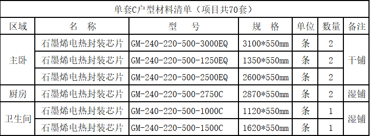 本项目采用利物盛石墨烯电热封装芯片采暖系统。石墨烯电热封装芯片敷设在装饰层底面,加热地面后向室内通过辐射向空间传递热量。项目供暖总负荷约为1987.2KW;电热膜选用GM-240-220-500系列。地暖系统通电后,石墨烯基团内部电子在电场作用下产生定向移动,该过程中电子与石墨烯中的碳原子产生碰撞而发热,形成光电流,实现电热转化,释放远红外光波,采用石墨烯制成的电热材料具有更高的电热转化效率和更好的热均匀性。