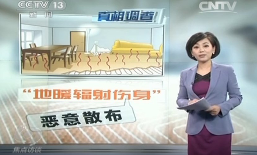央视曾在《焦点访谈》栏目中,联合专家实地检测居民家中的电热膜地暖系统,结果显示安装电热膜的地砖表面的电磁辐射量极低(0.08微特斯拉),远低于电熨斗(40微特斯拉)、电磁炉(20微特斯拉)、手机通话峰值(0.39微特斯拉)等家庭常用设备。节目中援引中国辐射供暖供冷委员会专家的观点,说明地暖通过热辐射传递热量属于正常物理现象,日常生活中不会危害人体健康。